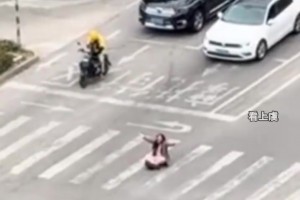 女子坐在斑马线上张开双臂呐喊。疑似投资暴雷,财产损失严重